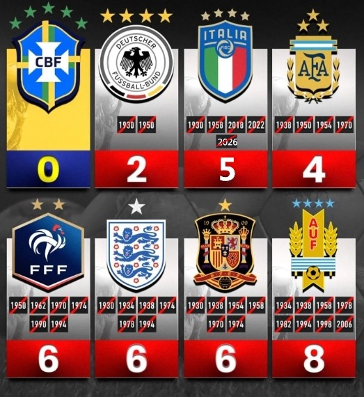 意大利足球杯被钉上了历史耻辱柱,但他们并不是豪门中唯一的显眼包。曾经夺得过世界杯的八支球队中,只有巴西从未缺席世界杯,其他7支球队都曾有过无缘大舞台的至暗时刻。